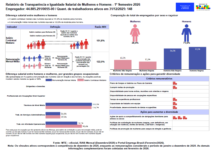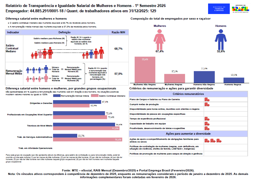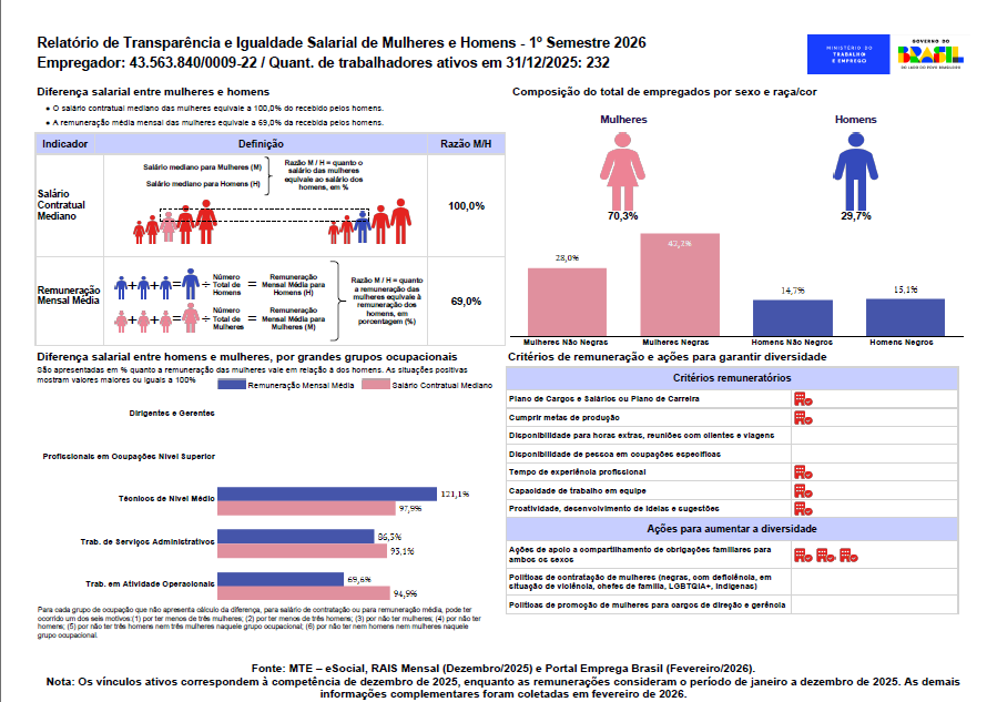 Ao compartilhar este relatório, cumprimos a determinação legal de divulgação pública das informações. Reafirmamos nosso compromisso com a transparência e a missão de criar um espaço de trabalho inclusivo e justo para todos os colaboradores, por meio de práticas e políticas de diversidade e inclusão já divulgadas pela empresa.